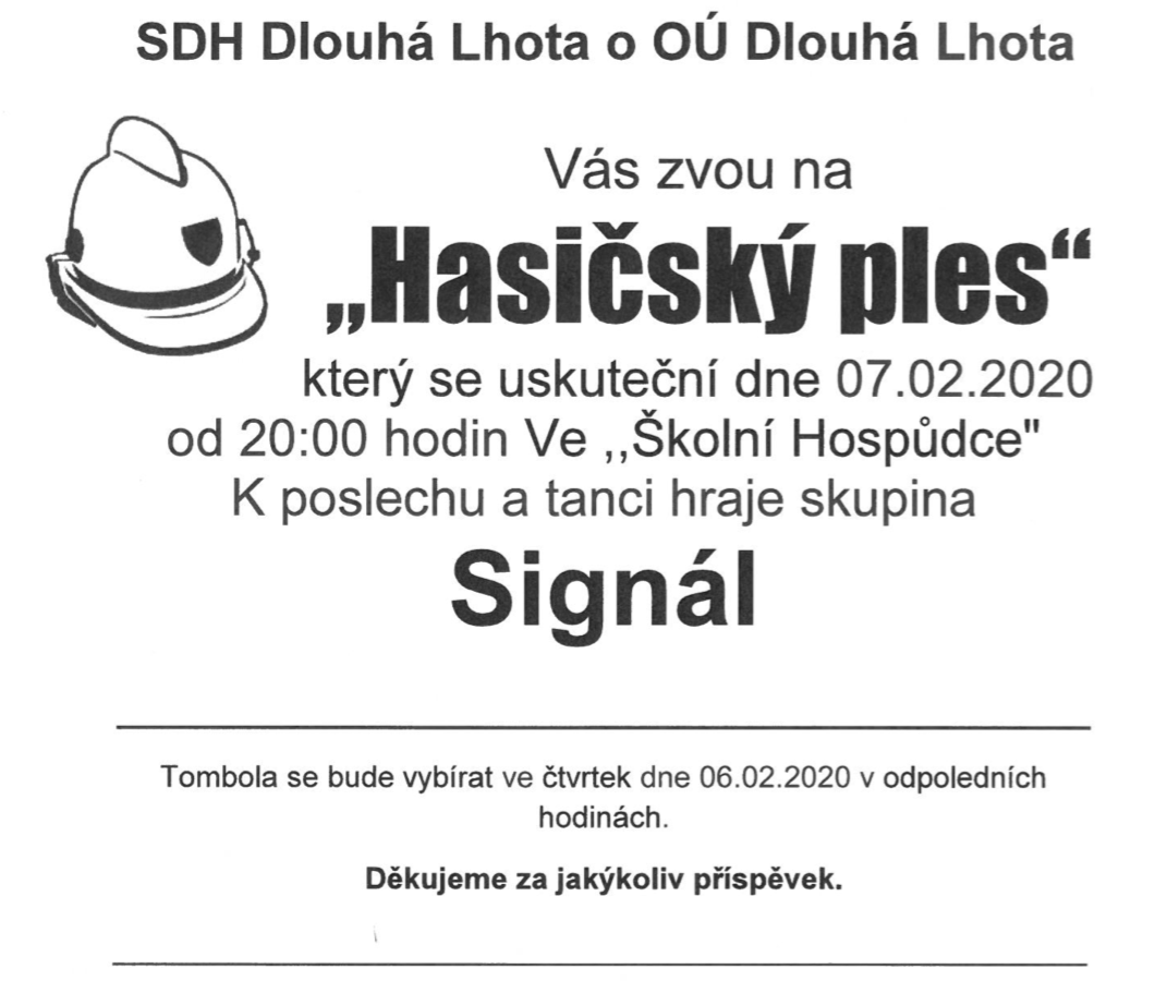 plesSDH Dlouhá Lhota a OÚ Dlouhá Lhota Vás zvou na Hasičský ples dne 7.2.2020 od 20:00 ve Školní Hospůdce. Hrát nám bude skupina Signál.